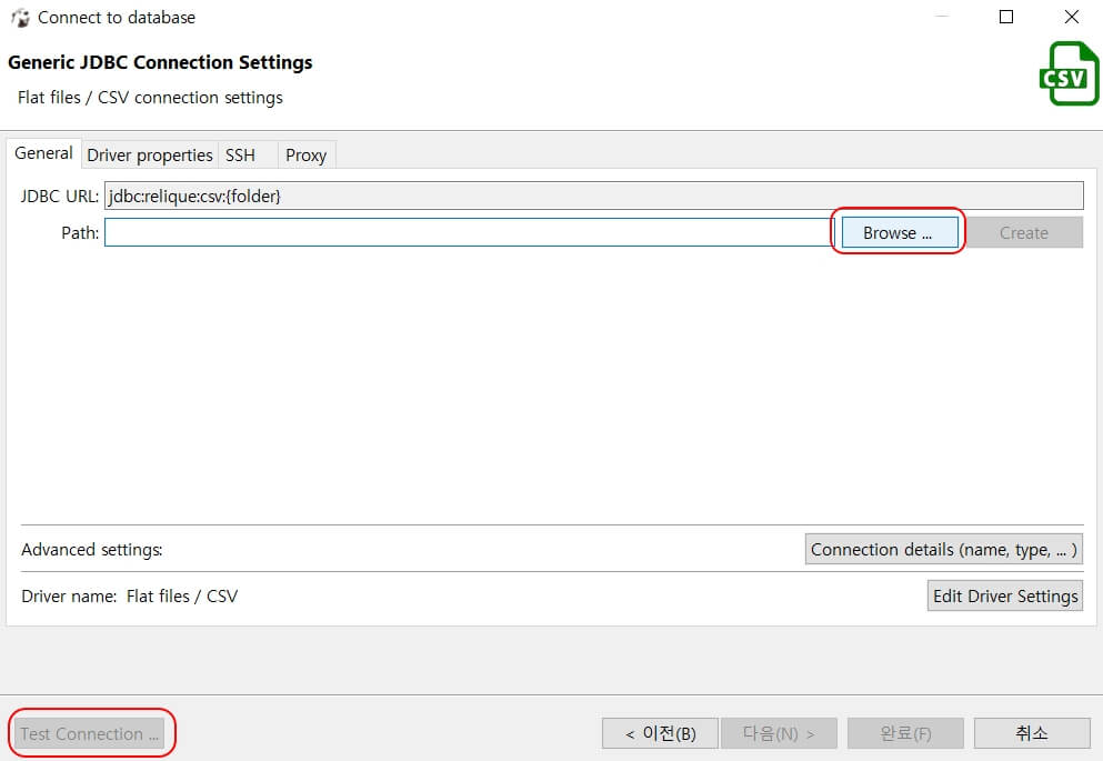 2. CSV가 있는 폴더 경로를 Path에 지정해주세요. 그리고 Test Connection을 선택합니다.