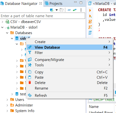 1. ERD를 보고자 하는 데이터베이스를 더블클릭하거나 우클릭 후 View Database롤 클릭합니다.