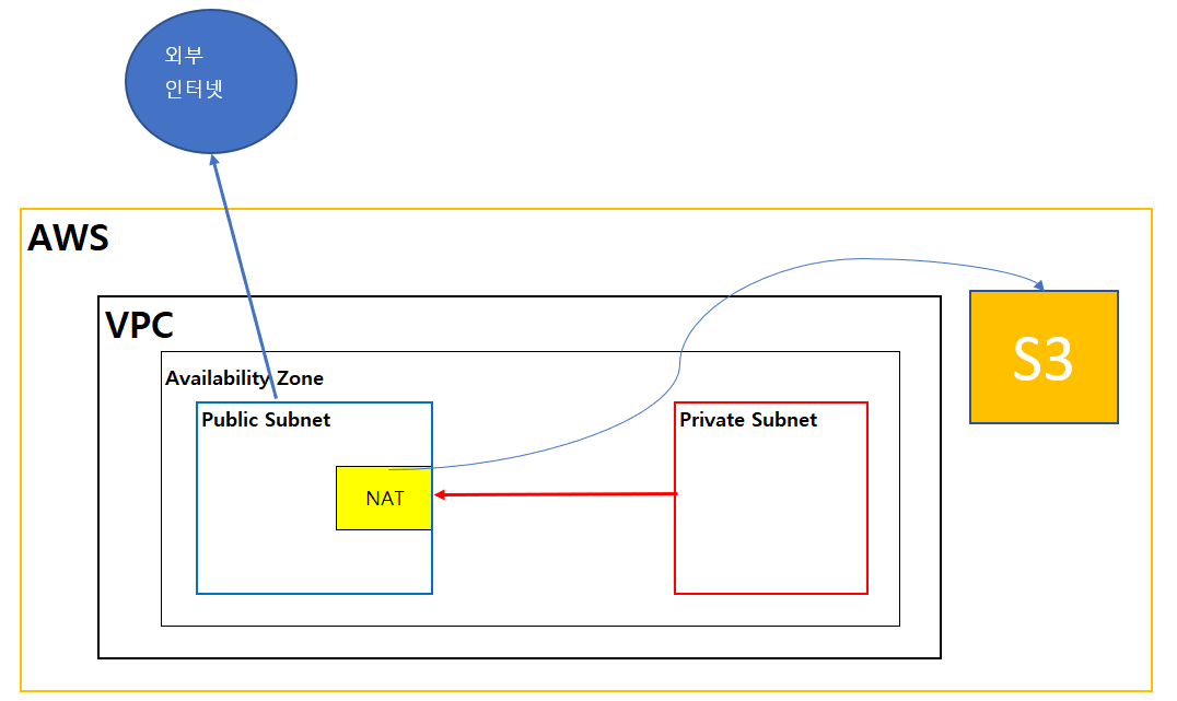 그림에서 보는 것처럼 프라이빗 서브넷은 외부 인터넷뿐만 아니라, AWS 자체 서비스와 접속 시에도 NAT Gateway를 통하게 됩니다.