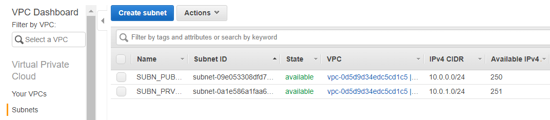 1. VPC 좌측 메뉴에서 Subnets을 선택합니다. 해당 화면에서는 이전에 생성했던 퍼블릭 서브넷과 프라이빗 서브넷을 확인할 수 있습니다. Actions 버튼을 통해 서브넷 삭제 등의 기능을 할 수 있습니다.