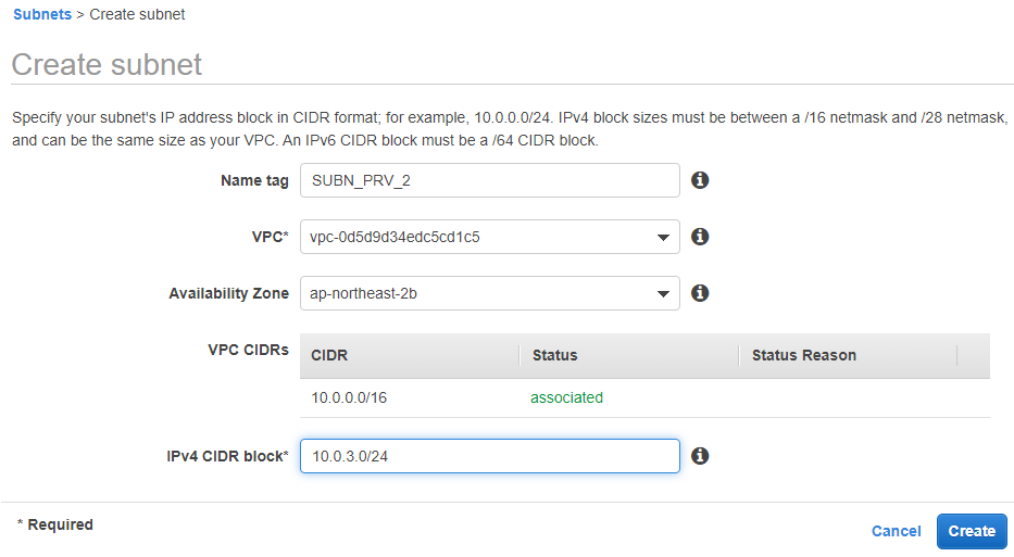 2. Create subnet 화면입니다. 만들 때는 몰랐는데 Name을 기존과 동일하게 만들었네요...