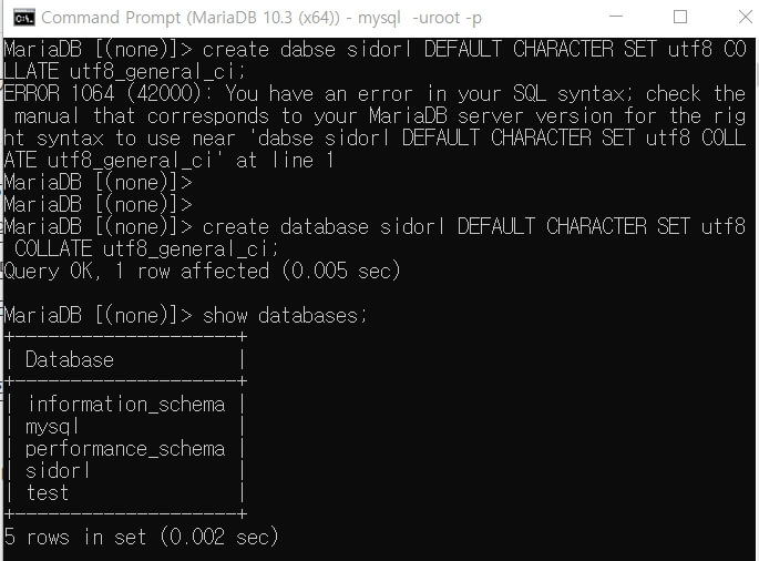 4. DB 생성 > create database db명 DEFAULT CHARACTER SET utf8 COLLATE utf8_general_ci;